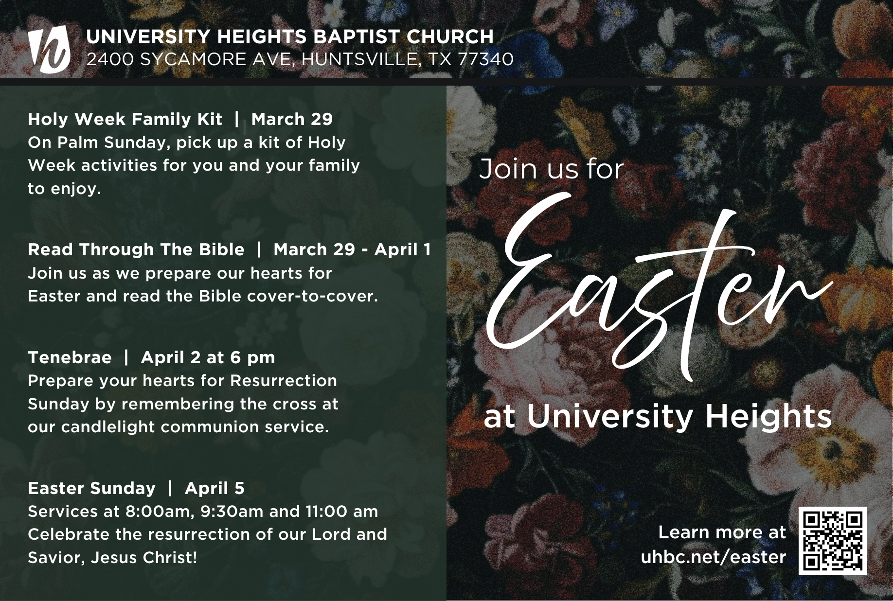 Join us in person and celebrate the resurrection of our Lord and Savior, Jesus Christ! Small Groups will meet as normal at 9:30am & 11:00 am.